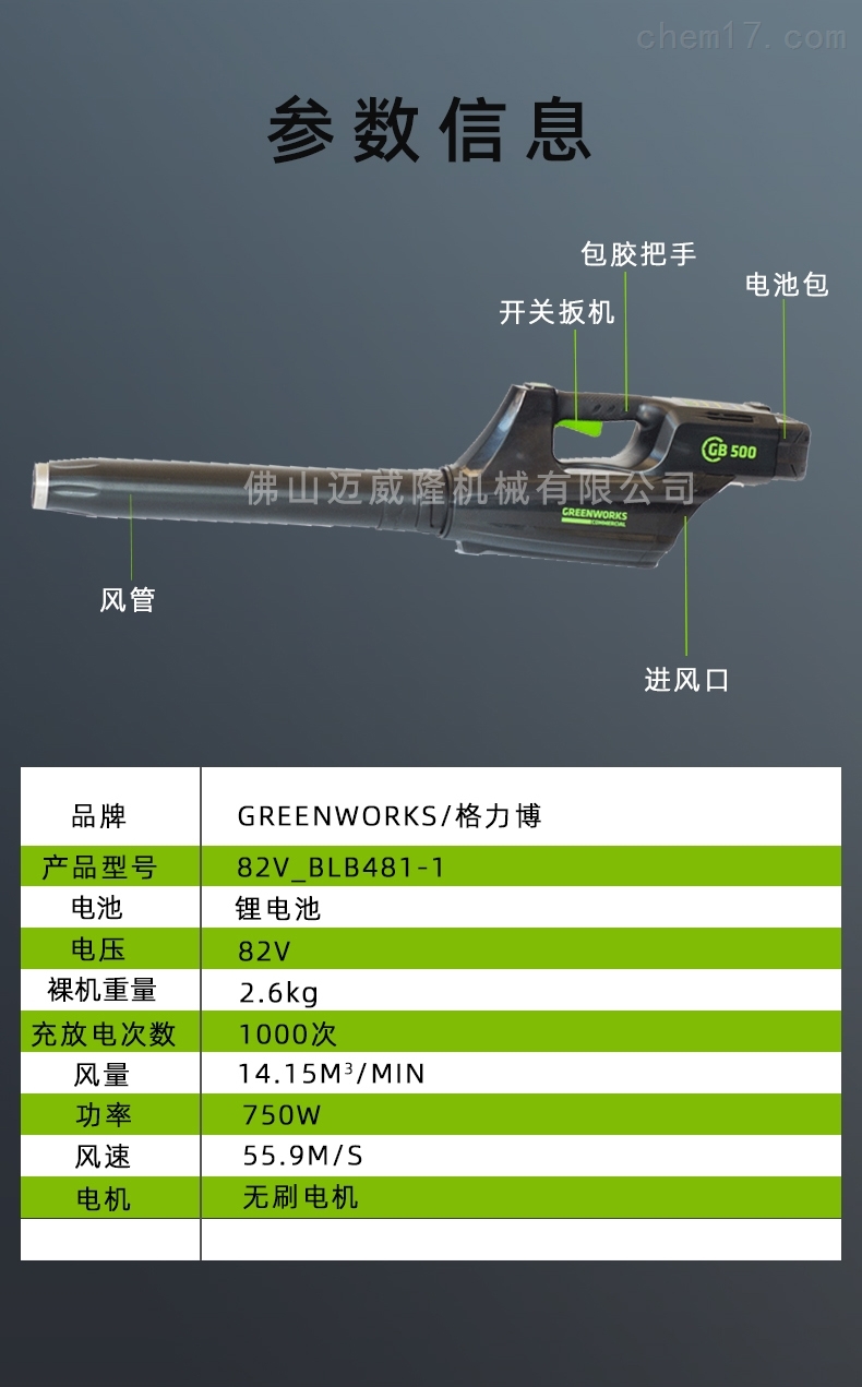 Glebe便攜式吹風(fēng)機(jī)blb481-1鋰吹灰器82v吹雪器森林滅火器產(chǎn)品參數(shù):品牌:greenworks/Glebe產(chǎn)品型號:82v_blb481-1電池:鋰電池電壓:82v裸機(jī)重量:2.6kg充放電次數(shù):1000倍風(fēng)量:14.15m3/min功率:750W風(fēng)速:55.9m/s電機(jī):無刷電機(jī)