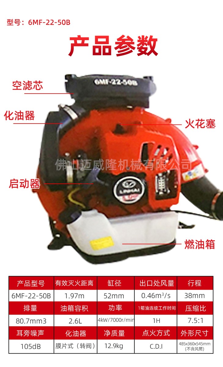 臨海臨海6mf-22-50b背負(fù)式風(fēng)力滅火器森林消防救援風(fēng)機(jī)二沖程除雪器產(chǎn)品參數(shù):產(chǎn)品型號(hào):6mf-22-50b有效滅火距離:1.97M氣缸直徑:52mm出口風(fēng)量:0.46m3/s沖程:38mm排量:80.7mm3油箱容積:2.6L功率:4kw轉(zhuǎn)速:7000r/min油箱油連續(xù)工作時(shí)間:1H壓縮比:7.5:1耳側(cè)噪聲:105dB化油器:隔膜式(旋轉(zhuǎn)閥)凈質(zhì)量:12.9kg點(diǎn)火方式:C.D.I外形尺寸:485x360x545mm(不含風(fēng)道)